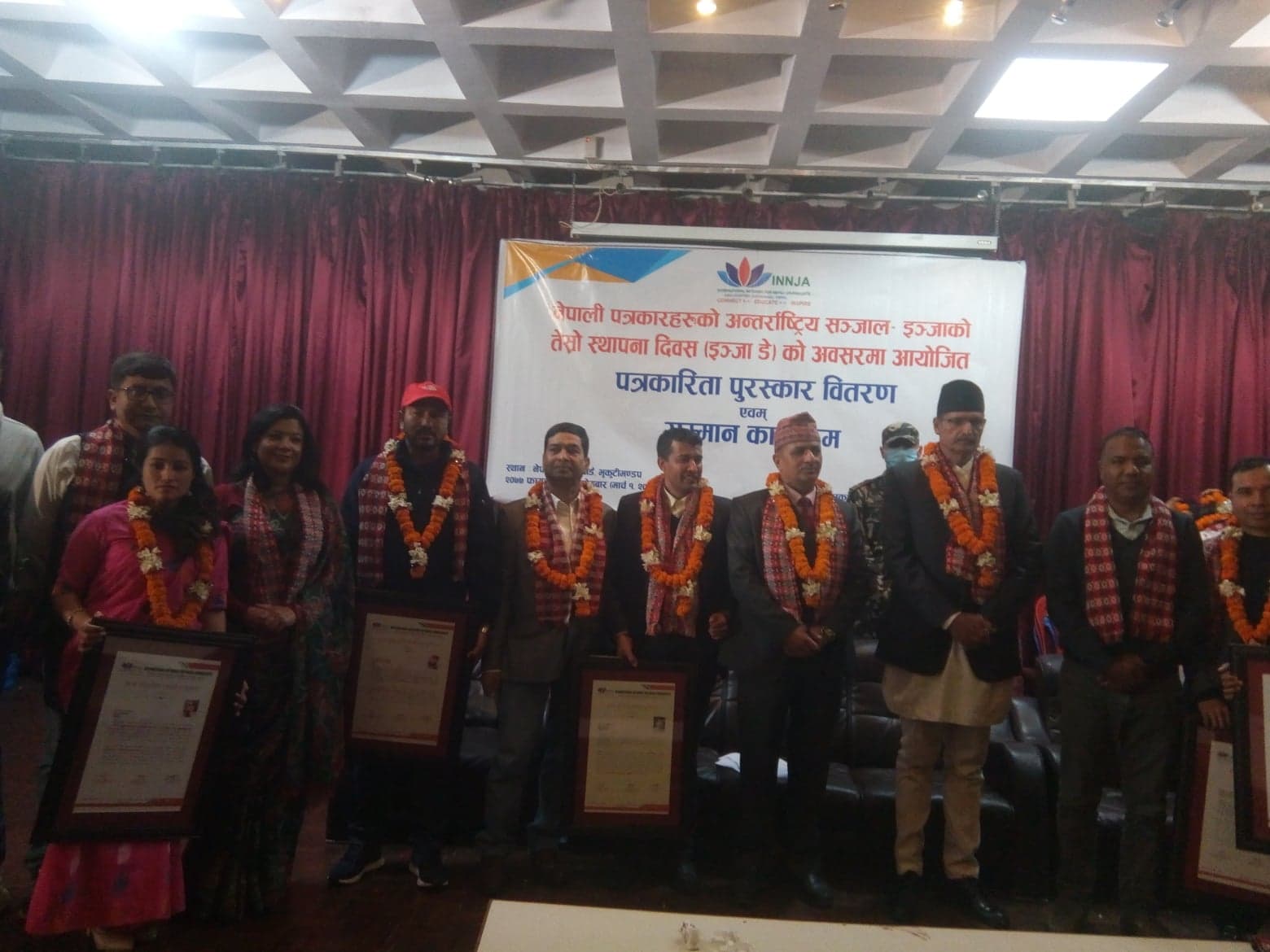 " /> काठमाडौं। नेपाली पत्रकारहरूको अन्तर्राष्ट्रिय सञ्जाल (इन्जा)ले साहित्यकार राजेन्द्र पराजुली, वरिष्ठ पत्रकार लालदेउसा राईलगायत अन्य पत्रकारहरूलाई आज पुरस्कृत गरेको छ।आफ्नो तेस्रो स्थापना दिवसको अवसरमा इन्जाले यसअघि घोषणा गरेको विभिन्न पुरस्कार तथा सम्मान प्रदान आज नेपाल पर्यटन बोर्डमा एक कार्यक्रमबीच प्रदान गरेको हो।