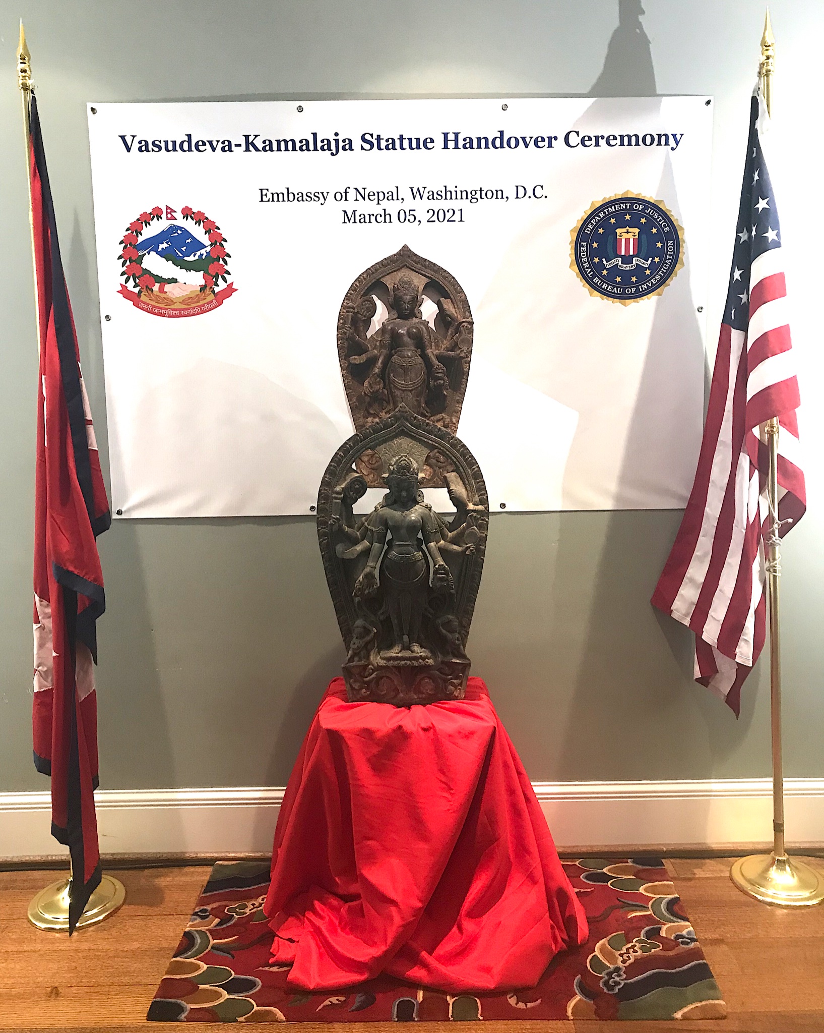 वासिङ्टन डीसीस्थित नेपाली दूतावासमा आयोजित कार्यक्रममा उक्त मूर्ति नेपाललाई हस्तान्तरण गरिएको नेपाली दूतावासले जनाएको छ। अमेरिकाका लागि नेपाली राजदूत डा. युवराज खतिवडाले उक्त मूर्ति बुझेका छन्। कार्यक्रममा राजदूत खतिवडासँगै एफबीआई तथा अमेरिकी विदेश मन्त्रालयका अधिकारीलगायतको उपस्थिति रहेको थियो।