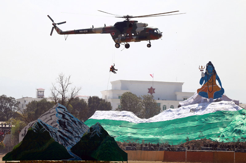 सेना दिवसको अवसरमा आयोजित उक्त कार्यक्रममा नेपाली सेनाको हेलिकप्टरले ‘महाशिवरात्री तथा सेना दिवस-२०७७’ अंकित व्यानर प्रदर्शन तथा पुष्पवृष्टि गरेको थियो। त्यसपछि षट्कोण फर्मेसन तथा नेपालको राष्ट्रिय झण्डाको आकृतिसमेत निर्माण गरी राइफल र तोपबाट महाशिवरात्रीको बढाइँ गरिएको थियो।<br />