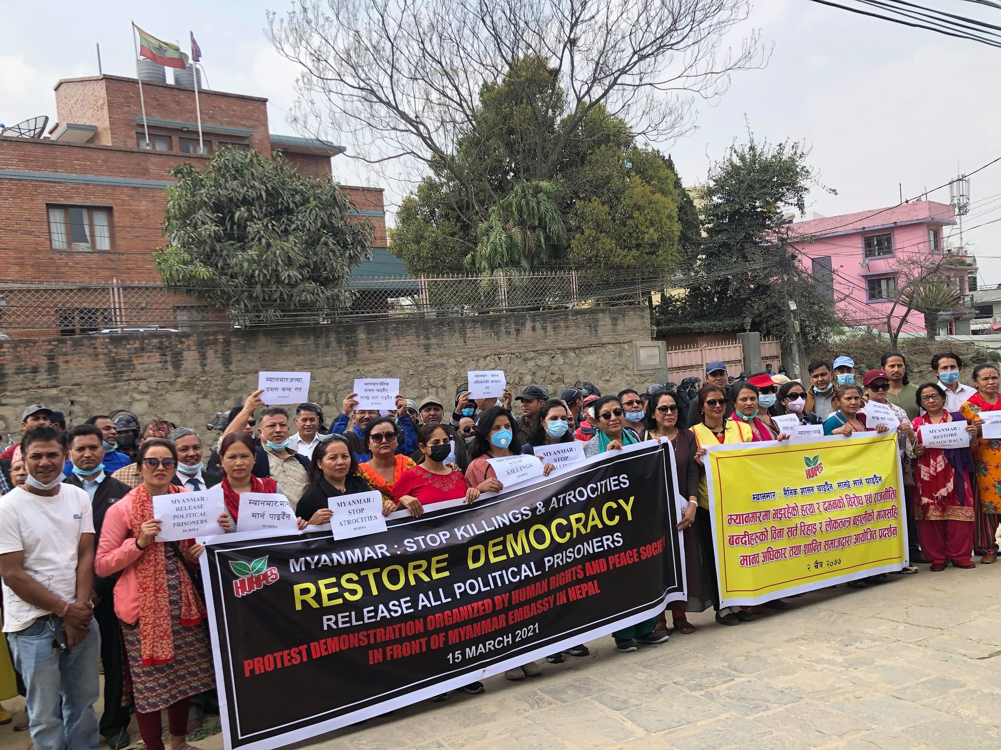 ललितपुर भैँसेपाटीस्थित म्यानमार दूतावासअगाडि दिउँसो भएको प्रदर्शनमा ‘म्यानमार : सैनिक शासन चाहिँदैन, मान्छे मार्न पाइँदैन’, ‘हत्या, दमन बन्द गर, लोकतन्त्र बहाली गर’, ‘राजनीतिक बन्दी रिहा गर, मानव अधिकारको सम्मान गर’ लेखिएका ब्यानर तथा प्लेकार्ड प्रदर्शन गरिएको थियो।