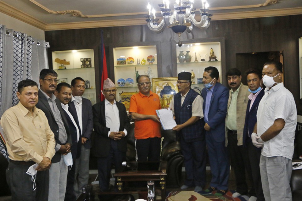 " /> काठमाडौं। यातायात क्षेत्रको विद्यमान समस्या समाधान गर्नका लागि निर्माण गरिएको कार्यदलले आज बिहान नेपाल कम्युनिष्ट पार्टीका अध्यक्ष तथा पूर्व प्रधानमन्त्री पुष्पकमल दाहालसँग भेट गरेको छ। खुमलटारमा भएको भेटमा व्यवसायीहरूले कोभिड–१९ पश्चात यातायात सञ्चालनमा देखिएका समस्याबारे ध्यानाकर्षण गराएका छन्।भेटमा नेकपा अध्यक्ष दाहालले यातायात व्यवसाय मध्यम र निम्न वर्गको व्यापक सहभागिता भएको क्षेत्र भएकाले आफूले यस क्षेत्रलाई उच्च प्राथमिकतामा राखेको बताए। “व्यवसायीले राखेका सबै विषय गम्भीर छन्। कोभिड–१९ का सन्दर्भमा संसारभरिका देशहरूले राहत प्याकेज दिने गरेको देखिएको छ। यहाँ पनि यातायात व्यवसायी र मजदुरका समस्या समाधान गर्न केही न केही राहत वा सुविधाका बारेमा पार्टी र सरकारमा छलफल गर्छु। बरु नीतिगत कुरा अलिक पछि गर्दा पनि हुन्छ” भेटमा दाहालले भने।