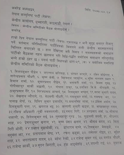 ‘‘हाम्रो प्रिय पार्टी नेकपालाई एकताबद्ध र झनै सुदृढ बनाएर लैजानुपर्ने वर्तमान परिस्थितिमा पार्टीभित्रको विवादले हामी केन्द्रीय सदस्यहरूलाई चिन्तित बनाएको छ,’’ पत्रमा उल्लेख छ, ‘‘हाल देखिएका विवाद र समस्याहरूको समाधान पार्टीको बैठकमा गहन छलफल गरी विधि-पद्धति बमोजिम समाधान गरिनुपर्दछ भन्ने हाम्रो ठहर छ। त्यसर्थ पार्टी विधानको धारा-५९ (क) ४ बमोजिम यथाशीघ्र केन्द्रीय समितिको बैठक बोलाइयोस्।’’