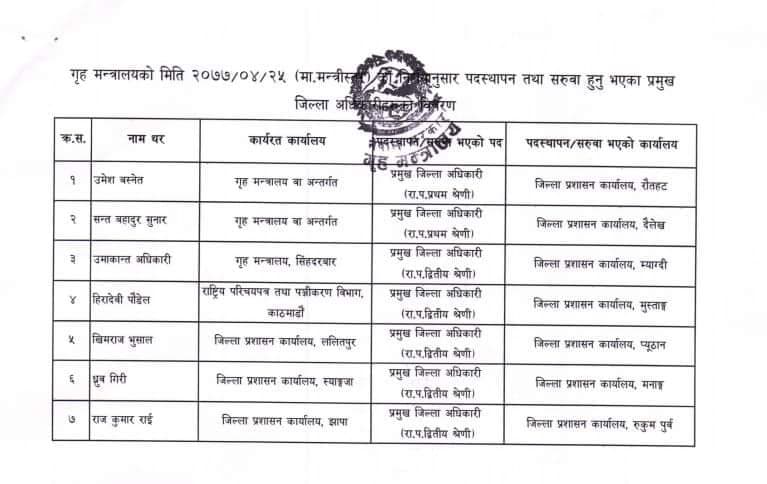 हिजाे बसेको गृहमन्त्रीस्तरको बैठकले सहसचिव उमेश बस्नेतलाई रौतहट र अर्का सहसचिव सन्तबहादुर सुनारलाई दैलेखको प्रमुख जिल्ला अधिकारी बनाउने निर्णय गरेको हो। दुवै जना यसअघि गृह मन्त्रालय मातहतको विभिन्न महाशाखा प्रमुखको भूमिकामा थिए।