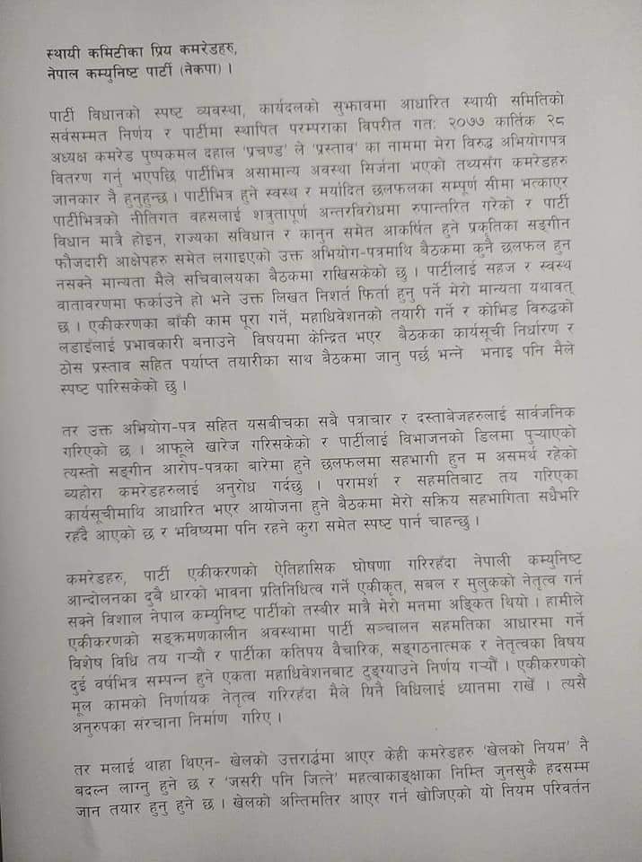 “प्रधानमन्त्रीज्यू आजको बैठकमा नआए पनिउहाँले स्थायी कमिटी बैठकलाई पत्र लेख्दै प्रचण्डको प्रस्तावमा छलफल गर्न नसकिने भएकाले आउन नसकेको जनाउनुभएको छ,” प्रवक्ता नारायणकाजी श्रेष्ठले भने, “उहाँ पूर्ववत् मान्यता र अडानमा कायम हुनुहुन्छ भन्ने पत्रले नै देखाएको छ।”