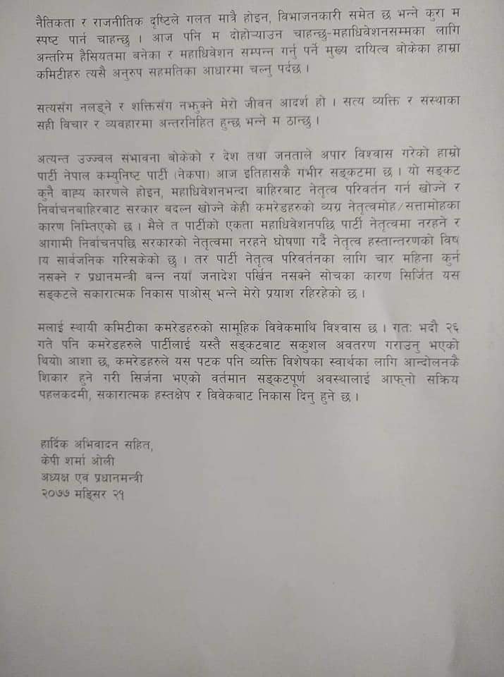 प्रधानमन्त्रीले स्थायी कमिटी बैठकलाई पठाएको पत्रलाई उपप्रधानमन्त्री ईश्वर पोखरेलले वाचन गरेर सुनाएका थिए, प्रधानमन्त्रीको पत्रमा दुवै प्रस्ताव छलफलको अजेन्डा नबनाई सहमतिको आधारमा एकल दस्तावेज बनाउनुपर्ने प्रस्ताव ओलीले बैठकसमक्ष राखेका छन्।