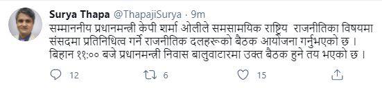 <p style="text-align: justify;">‘समसमायिक राजनीतिक विषयमा छलफल गर्न प्रधानमन्त्रीज्यूले सर्वदलीय बैठकको आह्वान गर्नु भएको हो, भोलि ११ बजे सो बैठक बस्ने छ,’ प्रधानमन्त्रीका प्रेस संयोजक सूर्य थापाले भने।</p>