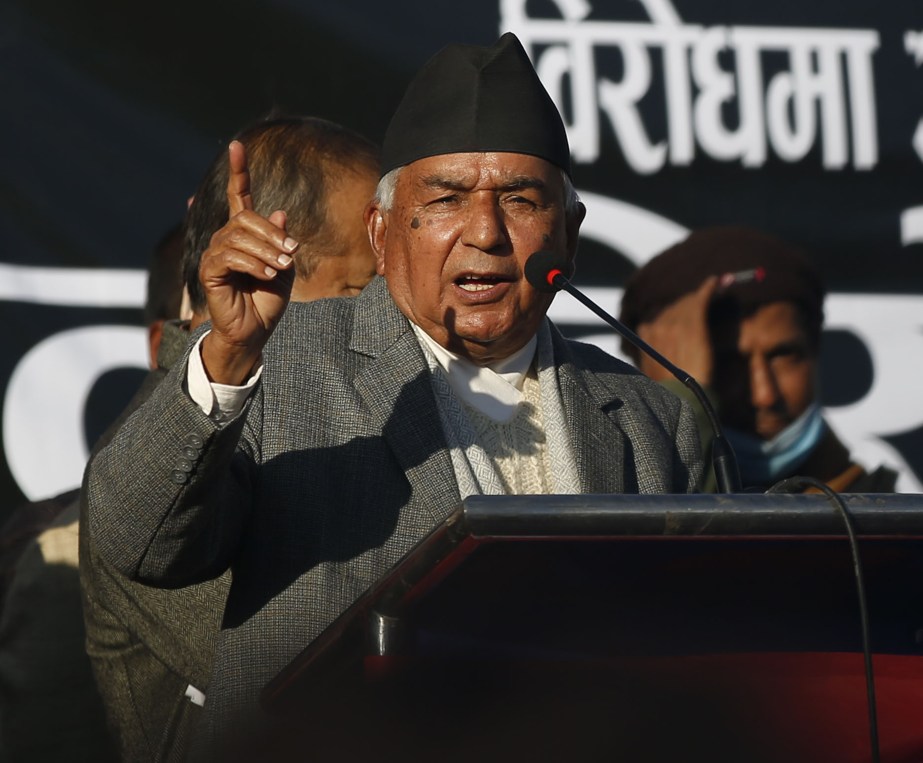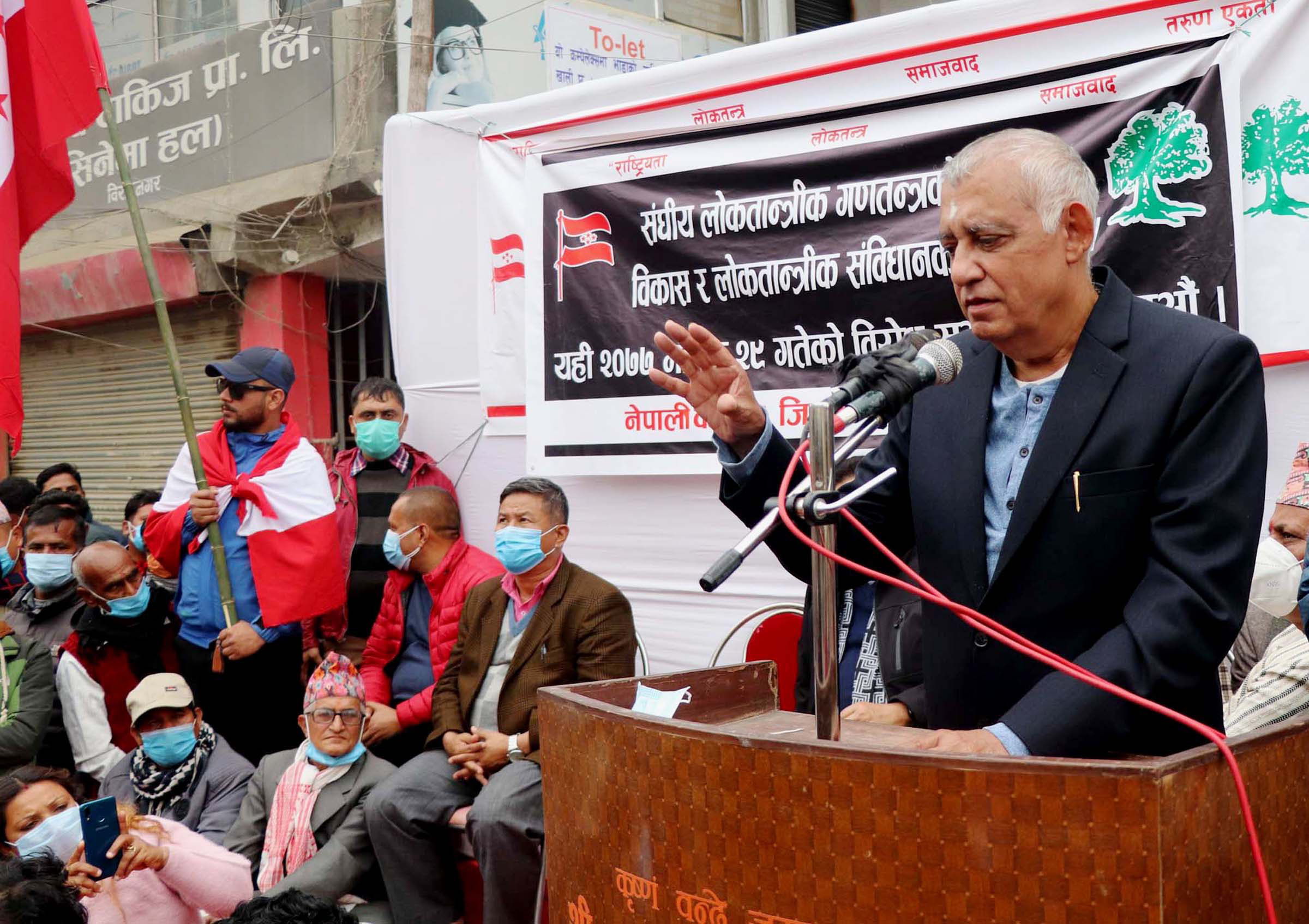 वरिष्ठ नेता रामचन्द्र पौडेलले काठमाडौंको शान्ति बाटिकामा आयोजित प्रदर्शनलाई सम्बोधन गर्दै राजाको पालामा लोकतन्त्रको पक्षमा बोलिँदा टाउको काट्ने गरेकोमा कम्युनिस्ट सरकारले पुल उद्घाटन गर्दा करङ भाँच्न खोजेको आरोप लगाएका छन्।