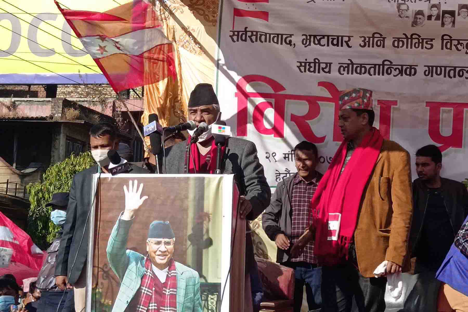 मकवानपुरको हेटौंडामा आयोजित प्रदर्शनलाई सम्बोधन गर्दै उनले राजावादीहरूले सडकमा गरेको आन्दोलनमा ओली सरकार नै जिम्मेवार रहेको पनि आरोप लगाए।