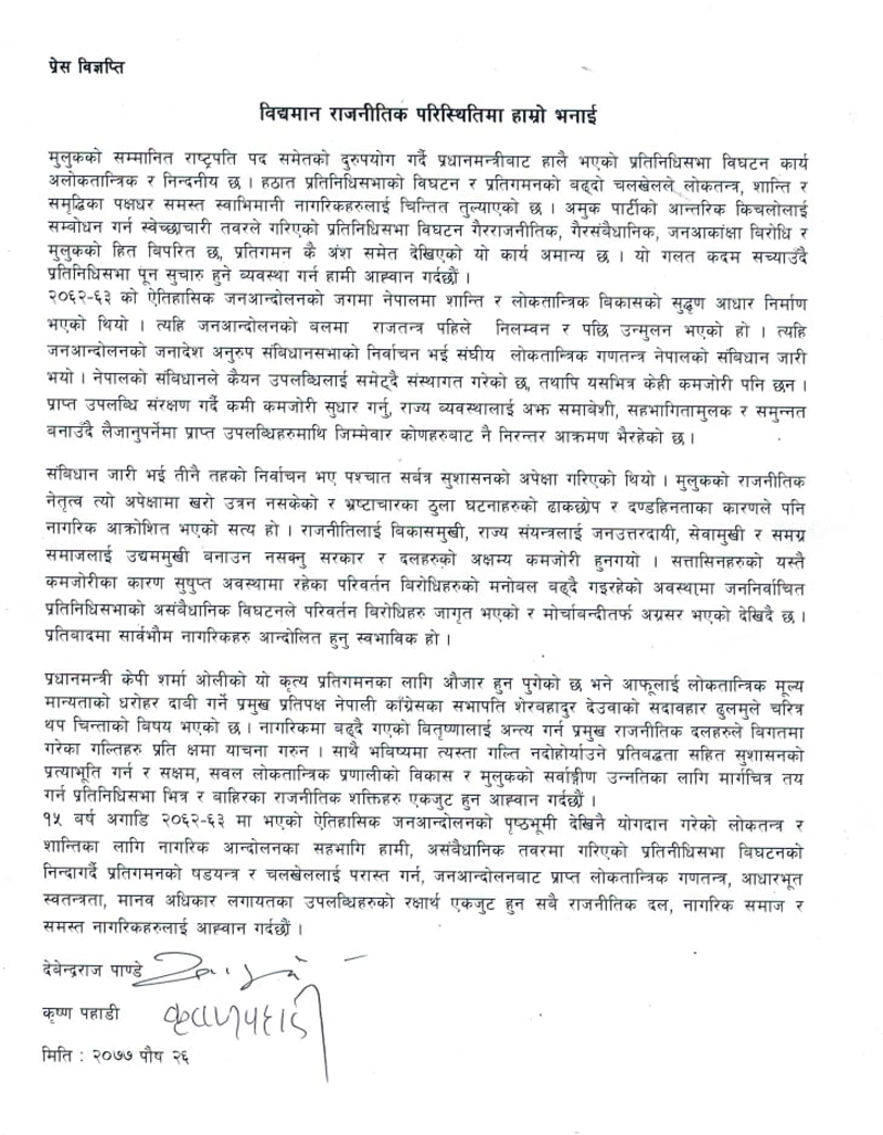 नागरिक अगुवा तथा अधिकारकर्मी डा. देवेन्द्रराज पाण्डे र कृष्ण पहाडीले राष्ट्रपति पदसमेतको दुरूपयोग गर्दै प्रधानमन्त्रीले हालै गरेको प्रतिनिधिसभा विघटन अलोकतान्त्रिक र निन्दनीय भएको बताएका छन्।