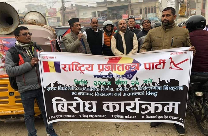 <p style="text-align: justify;">नवलपरासीको महेशपुरमा निकालिएको विरोध र्‍यालीलाई आज बिहान सम्बोधन गर्दै उनले हिन्दू राष्ट्रको मागसहित देशव्यापी जनलहर उर्लिएको बताए। देश र जनताको चाहना अनुसार हिन्दू राष्ट्र पुनर्स्थापना हुनुपर्ने उनले बताए।</p>
