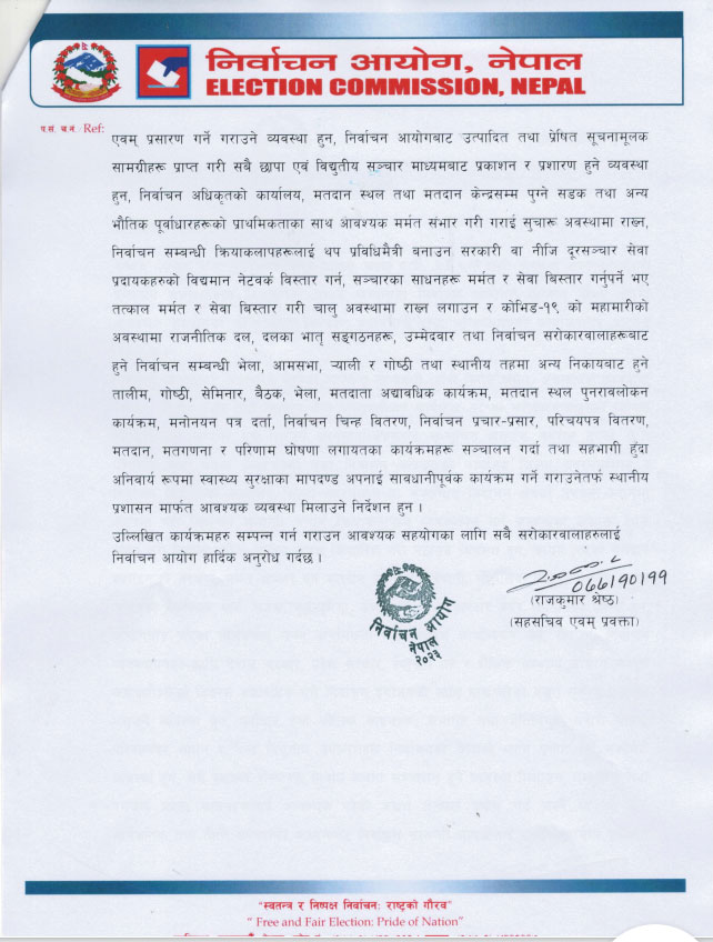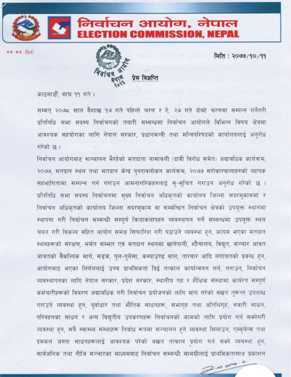 <p style="text-align: justify;">आयोगले आज विज्ञप्ति जारी गरी निर्वाचनसम्बन्धी आवश्यक विभिन्न सहयोगका लागि प्रधानमन्त्री तथा मन्त्रिपरिषद् कार्यालयसमक्ष अनुरोध गरिएको जानकारी दिएको हो। </p>
