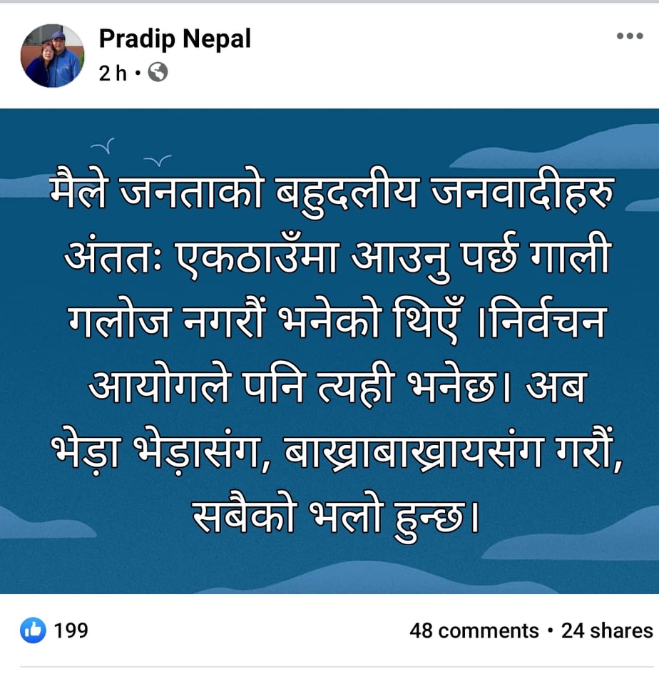 काठमाडौं। नेकपा नेता एवं लेखक प्रदीप नेपालले ‘जनताको बहुदलीय जनवाद’ पक्षधर एक ठाउँमा आउनु पर्ने बताएका छन्।