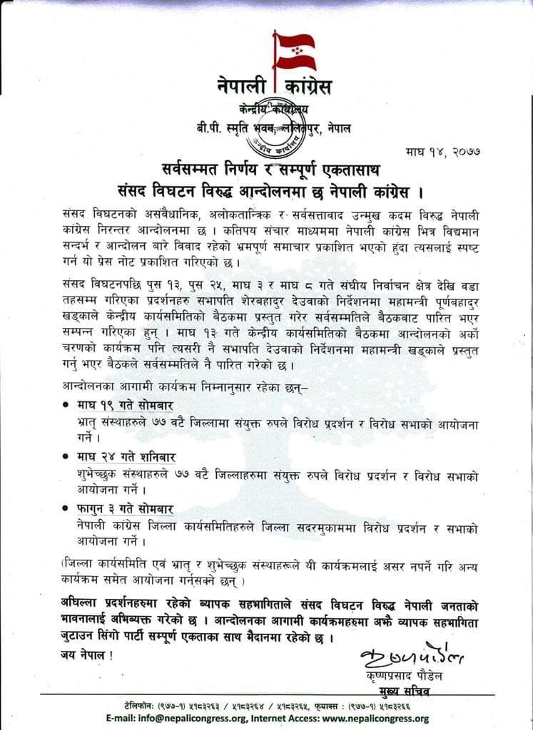 कांग्रेस सभापति शेरबहादुर देउवाले प्रतिनिधिसभा विघटनको विपक्षमा नबोल्न नेता कार्यकर्तालाई निर्देशन दिइरहेपनि माघ १३ गते बसेको केन्द्रिय समितिको बैठकले आन्दोलनका थप कार्यक्रम घोषणा गरेका हो। कांग्रेस केन्द्रीय समिति बैठकले प्रतिनिधिसभा विघटनविरूद्ध जारी रहेको आन्दोलनका कार्यक्रमलाई निरन्तरता दिने निर्णय गरेको हो।