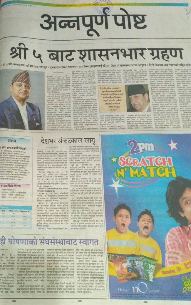 अन्नपूर्ण पोस्टले माघ २० गतेको अंकको पहिलो पृष्ठमा प्रकाशन गरेका सबै चारवटै समाचार राजाको कदमसँग सम्बन्धित थिए। अन्नपूर्णले ‘श्री ५ बाट शासनभार ग्रहण’, ‘सरकारी सेवा प्रभावकारी बनाइने’, ‘देशभर संकटकाल लागू’ र ‘शाही घोषणाको संघसंस्थाबाट स्वागत’ शीर्षकमा समाचार प्रकाशन गरेको थियो।