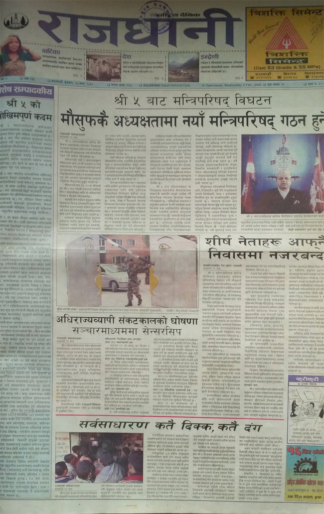 “संकटकालको घोषणासँगै छापा तथा प्रसारण माध्यममा सेन्सरसिप (प्रकाशनपूर्वको जाँच) सुरु भएको छ। संविधानको धारा १३ को (१) मा उल्लेखित ‘कुनै समाचार, लेख वा अन्य कुनै पाठ्यसामग्री प्रकाशित गर्नु पूर्व प्रतिबन्ध लगाइने छैन’ निलम्बन गरिएपछि सेन्सरसिप सुरु भएको हो,” राजधानीको समाचारमा लेखिएको छ।