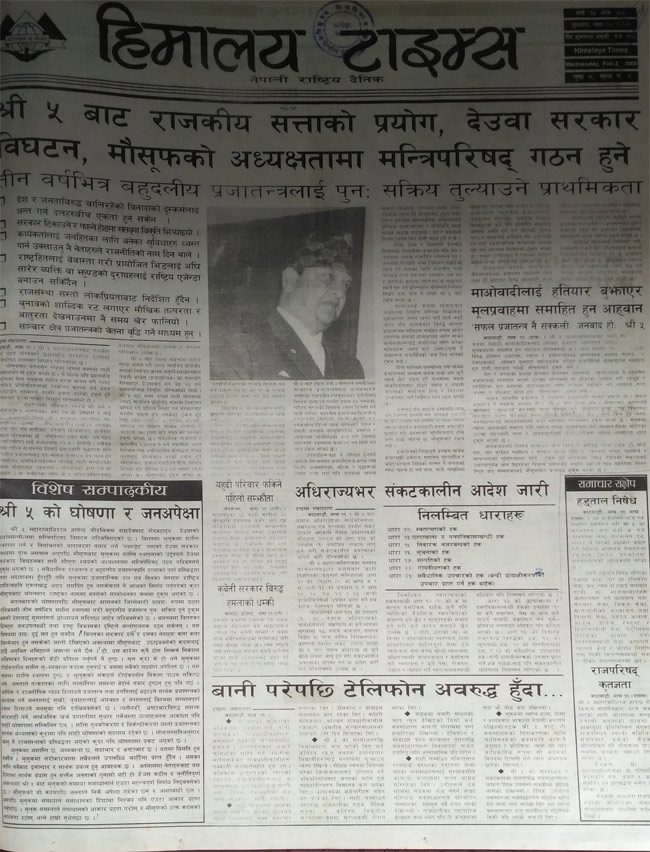 ‘श्री ५ बाट राजकीय सत्ताको प्रयोग, देउवा सरकार विघटन, मौसूफको अध्यक्षतामा मन्त्रिपरिषद् गठन हुने’, ‘माओवादीलाई हतियार बुझाएर मूलप्रवाहमा समाहित हुन आह्वान’, ‘अधिकारज्यभर संकटकालीन आदेश जारी’, ‘हड्ताल निषेध’, ‘राजपरिषद् कृतज्ञता’ र ‘बानी परेपछि टेलिफोन अवरुद्ध हुँदा’ शीर्षकमा हिमालय टाइम्सको पहिलो पृष्ठमा समाचार थिए।