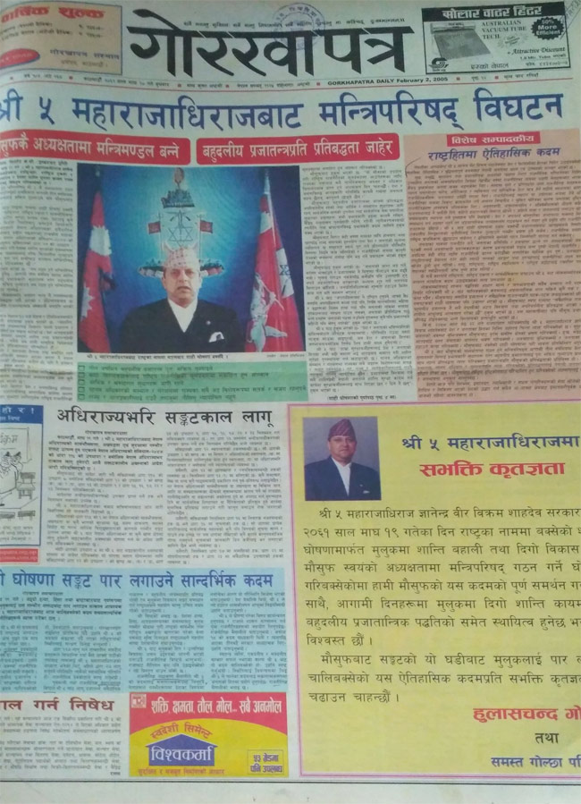“नेपालीका आस्था केन्द्र श्री ५ ज्ञानेन्द्र वीर विक्रम शाहदेवबाट देश र देशवासीको हितका निम्ति उठाबस्केको साहसिक, ऐतिहासिक र बुद्धिमत्तापूर्ण कदमबाट नेपाली जनतामा आशा एवं उत्साहको सञ्चार भएको छ,” गोरखापत्रले आफ्नो विशेष सम्पादकीयमा लेखेको थियो।