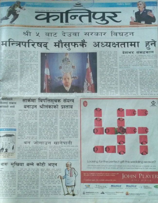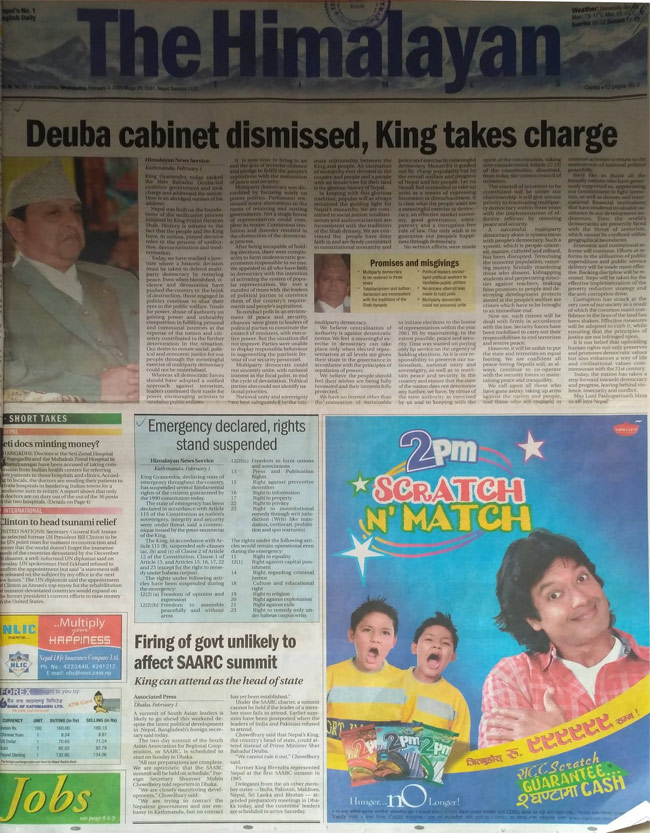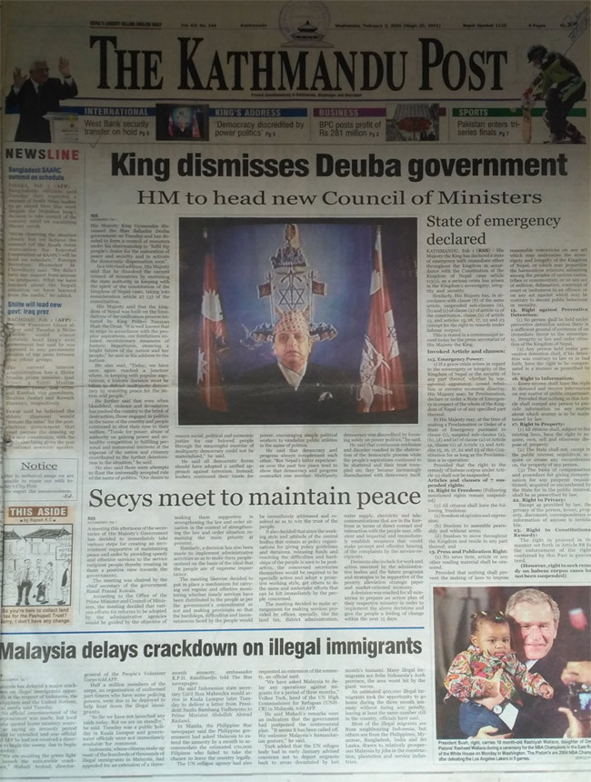 ‘किङ डिस्मिसेस देउवा गभर्नमेन्ट’, ‘स्टेट इमर्जेन्सी डिक्लियर्ड’ र ‘सेक्रेटरिज मिट टु मेनटेन पिस’ शीर्षकमा काठमान्डू पोस्टले समाचार प्रकाशन गरेको थियो।