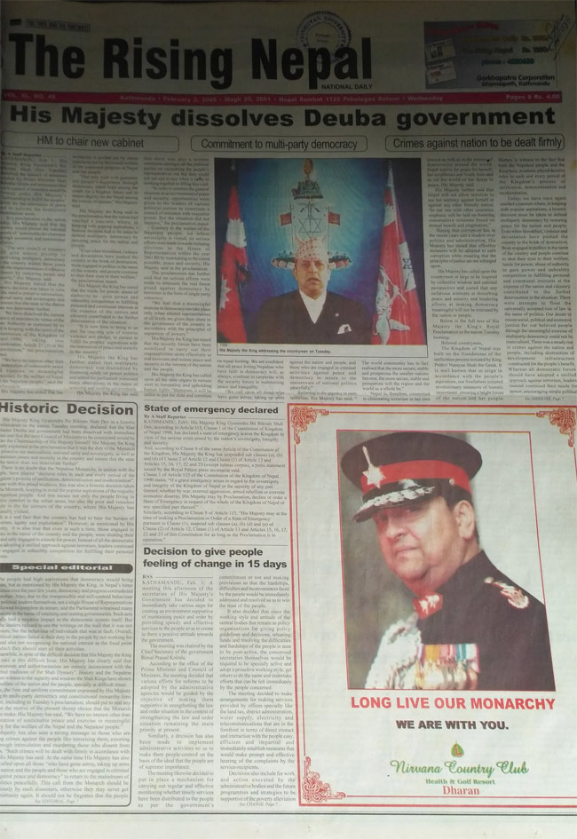 ‘हिज मेजेस्टी डिजल्भ्स देउवा गभर्नमेन्ट’, ‘हिस्टोरिक डिसिजन’, स्टेट अफ इमर्जेन्सी डिक्लियर्ड’ र ‘डिसिजन टु गिभ पिपुल फिलिङ अफ चेन्ज इन फिप्टिन डेज्’ शीर्षकमा दि राइजिङ नेपालले समाचार प्रकाशित गरेको थियो।