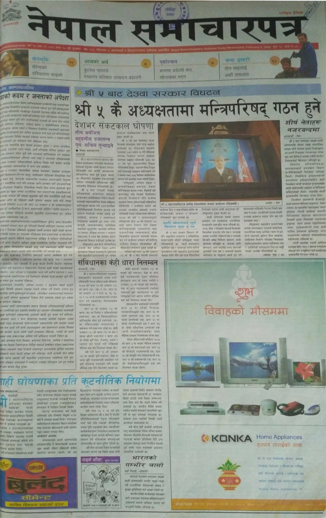“शाही घोषणासँगै मुलुकका सम्पूर्ण विद्युतीय सञ्चार माध्यमले सोही विषयलाई मुख्य समाचार बनाएका थए। टेलिफोन र मोबाइल सेवासमेत बन्द रहेका थिए। बाहिरी सम्पर्कबाट वञ्चित राजधानीवासीले एकहोरो विद्युतीय सञ्चारमाध्यमको समाचार हेरेर दिन बिताएका थिए,” हिमालय टाइम्सको समाचारमा उल्लेख छ।