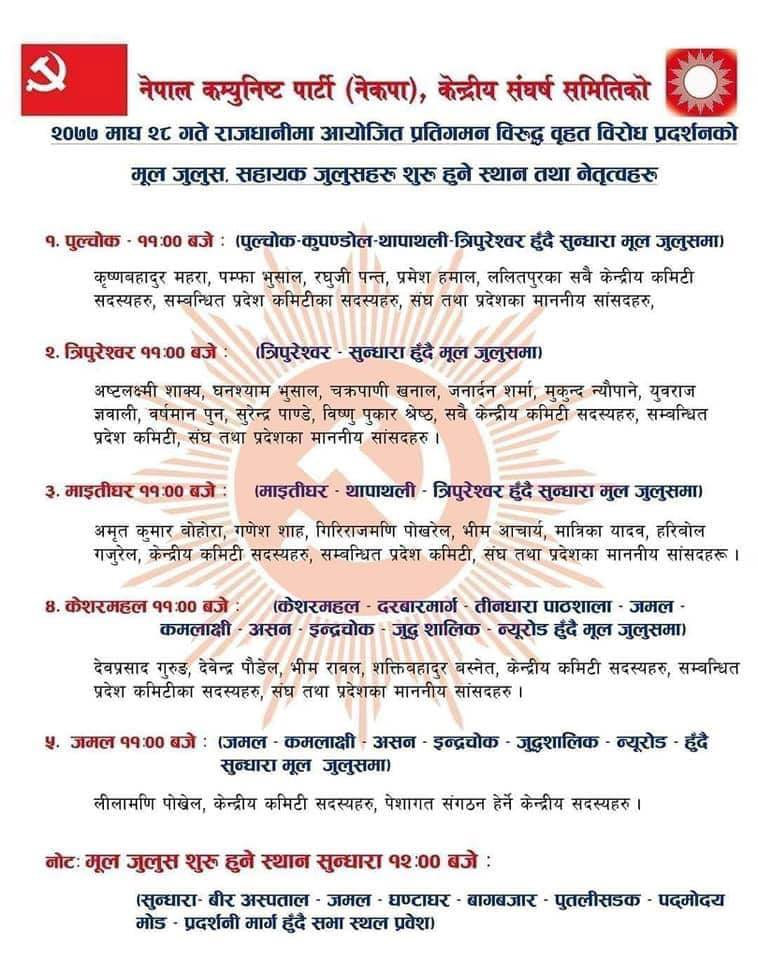 उनका अनुसार सुनधारा र केशरमहलबाट मूल जुलुस कार्यक्रमस्थलमा प्रवेश गर्नेछन् भने सुनधाराको जुलुसलाई अध्यक्ष पुष्पकमल दाहाल प्रचण्ड र केशरमहलको जुलुसलाई नारायणकाजी श्रेष्ठलगायतले नेतृत्व गर्ने छन्।