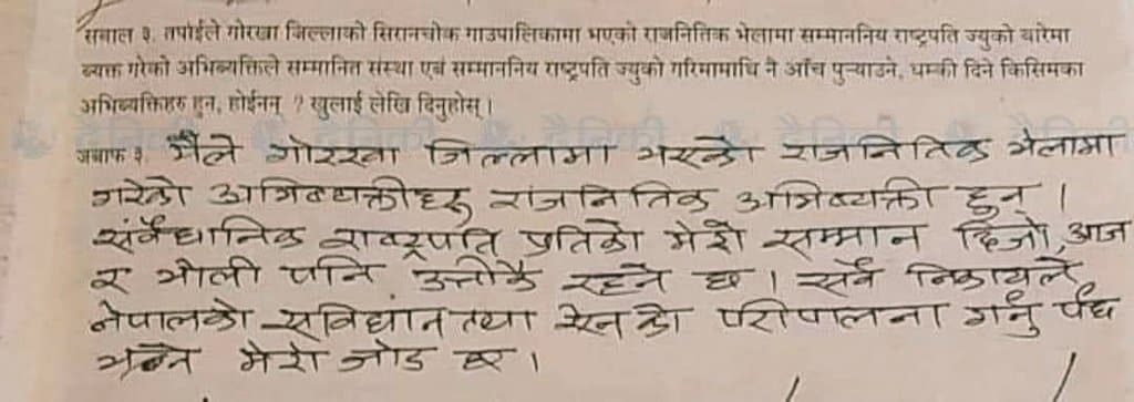 <p style="text-align: justify;">“संवैधानिक राष्ट्रपतिप्रतिको मेरो स्म्मान हिजो, आज र भोलि पनि उत्तिकै रहनेछ,” उनले लेखेकी छिन्, “सबै निकायले नेपालको संविधान तथा ऐनको परिपालना गर्नुपर्छ भन्ने मेरो जोड छ।”</p>