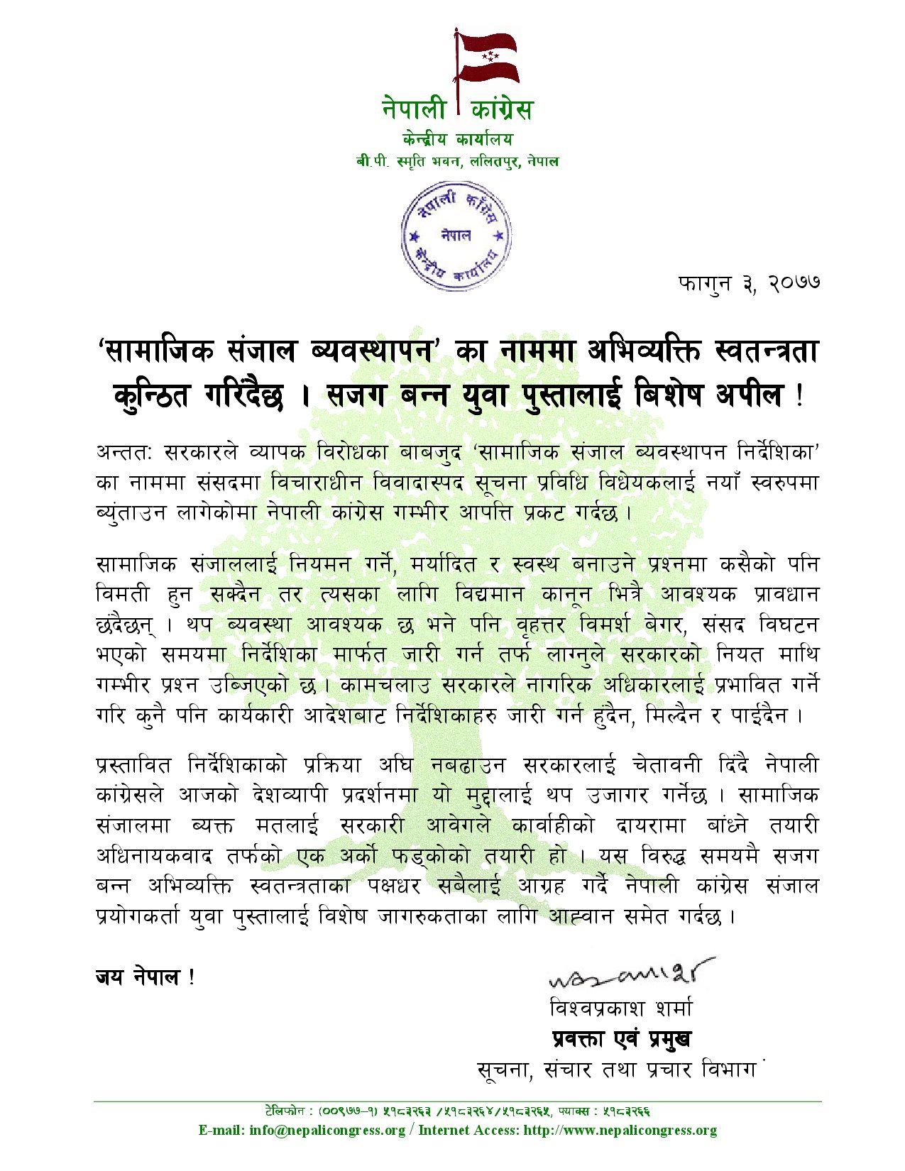 पार्टीका प्रवक्ता विश्वप्रकाश शर्माले सरकारले व्यापक विरोधका बाबजुद ‘सामाजिक सञ्जाल व्यवस्थापन निर्देशिका’को नाममा संसद्मा विचाराधीन विवादास्पद सूचना प्रविधि विधेयकलाई नयाँ स्वरूपमा ब्युँताउन लागेको बताएका छन्। उनले आज बिहान एक विज्ञप्ति जारी गर्दै भनेका छन्, “नेपाली कांग्रेस गम्भीर आपत्ति प्रकट गर्दछ।”