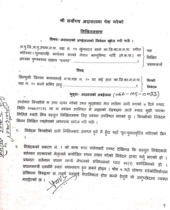 काठमाडाैं। नेपाल कम्युनिस्ट पार्टी (नेकपा)का अध्यक्ष पुष्पकमल दाहाल 'प्रचण्ड'ले सर्वोच्च अदालतमा लिखित जवाफ पेस गरेका छन्।