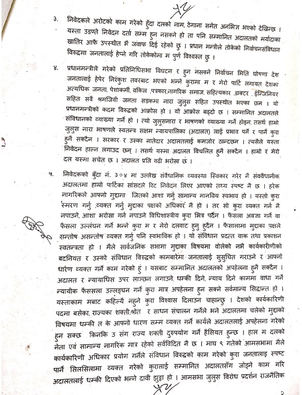 प्रधानमन्त्रीले गरेको प्रतिनिधिसभा विघटन र हुन नसक्ने निर्वाचन मिति घोषणा देश जनतालाई हेपेर निरंकुश तवरबाट भएको दाबी गर्दै सबै सडकमा नारा जुलुससहित उपस्थित भएको लिखित जवाफमा भनेका छन्।