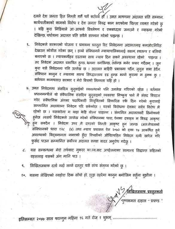 निवेदकले सरकारको योजना र प्रभावमा प्रस्तुत रिट निवेदनमा अदालतलाई कमजोर, निरीह देखाउन कोसिस गरेको प्रचण्डको दाबी छ।