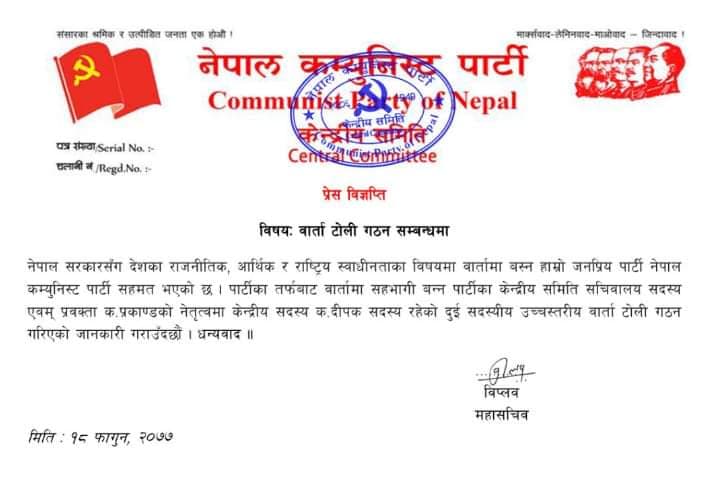 विज्ञप्तिमा सरकारसँग देशका राजनीतिक, आर्थिक, र राष्ट्रिय स्वाधीनताका विषयमा वार्तामा बस्न पार्टी सहमत भएपछि वार्ता टोली घोषणा गरेको बताइएको छ।