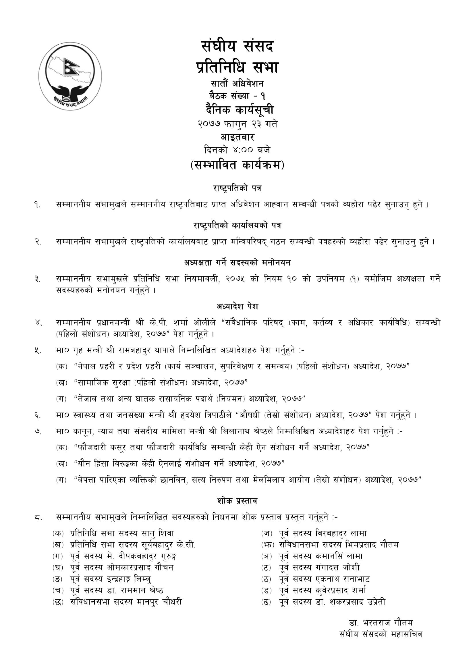 भोलिको बैठकमा सभामुखले राष्ट्रपतिबाट प्राप्त अधिवेशन आह्वानसम्बन्धी पत्रको व्यहोरा पढेर सुनाउने, त्यस्तै राष्ट्रपतिको कार्यालयबाट प्राप्त मन्त्रिपरिषद् गठन सम्बन्धी पत्रहरूको व्यहोरा पढेर सुनाउने कार्यतालिका छन्।