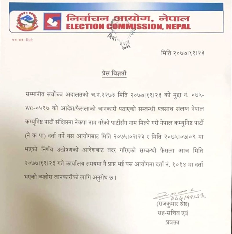 काठमाडौं। नेपाल कम्युनिस्ट पार्टी (नेकपा) को नामसम्बन्धी विवादमा गरेको फैसला/आदेशबारे सर्वोच्च अदालतले पठाएको पत्र निर्वाचन आयोगमा दर्ता भएको छ। आयोगले विज्ञप्ति जारी गरी सर्वोच्चको पत्र दर्ता भएको जानकारी दिएको हो।