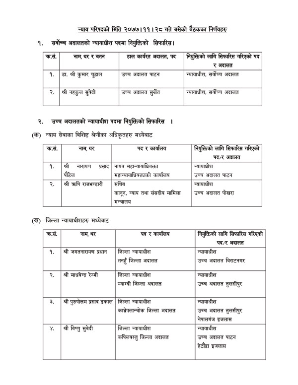 सर्वोच्च अदालतका लागि उच्च अदालत पाटनका मुख्य न्यायाधीश कुमार चुडाल र उच्च अदालत सुर्खेतका मुख्य न्यायाधीश नहकुल सुवेदीलाई नियुक्तिको लागि सिफारिस गरेको हो।