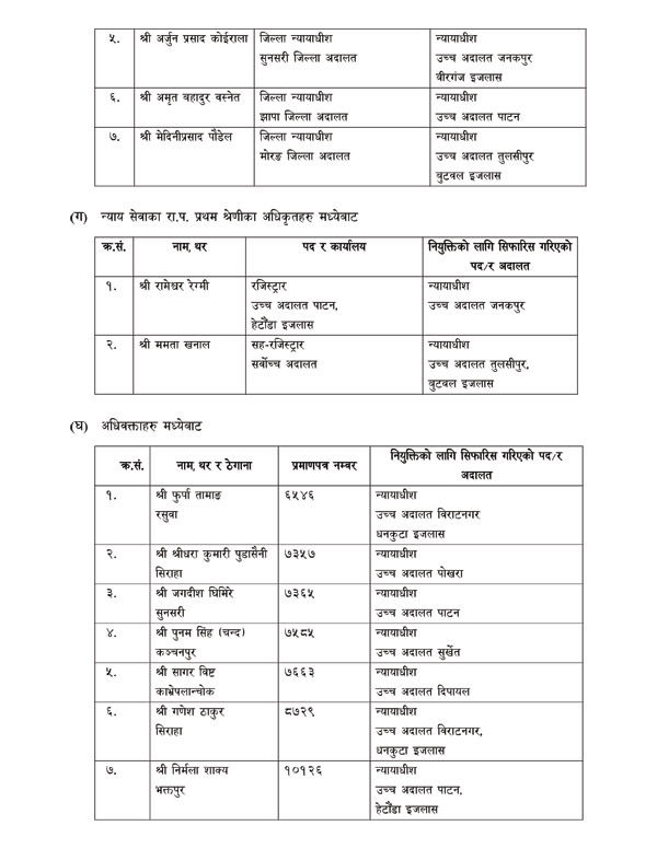 न्याय परिषद् सचिवालयका अनुसार न्याय सेवामा कार्यरत ११ जना अधिवक्तामध्येबाट सात गरी १८ जनालाई उच्च अदालतको न्यायाधीश नियुक्तिका लागि सिफारिस गरेको हो।