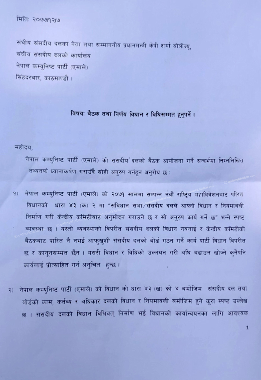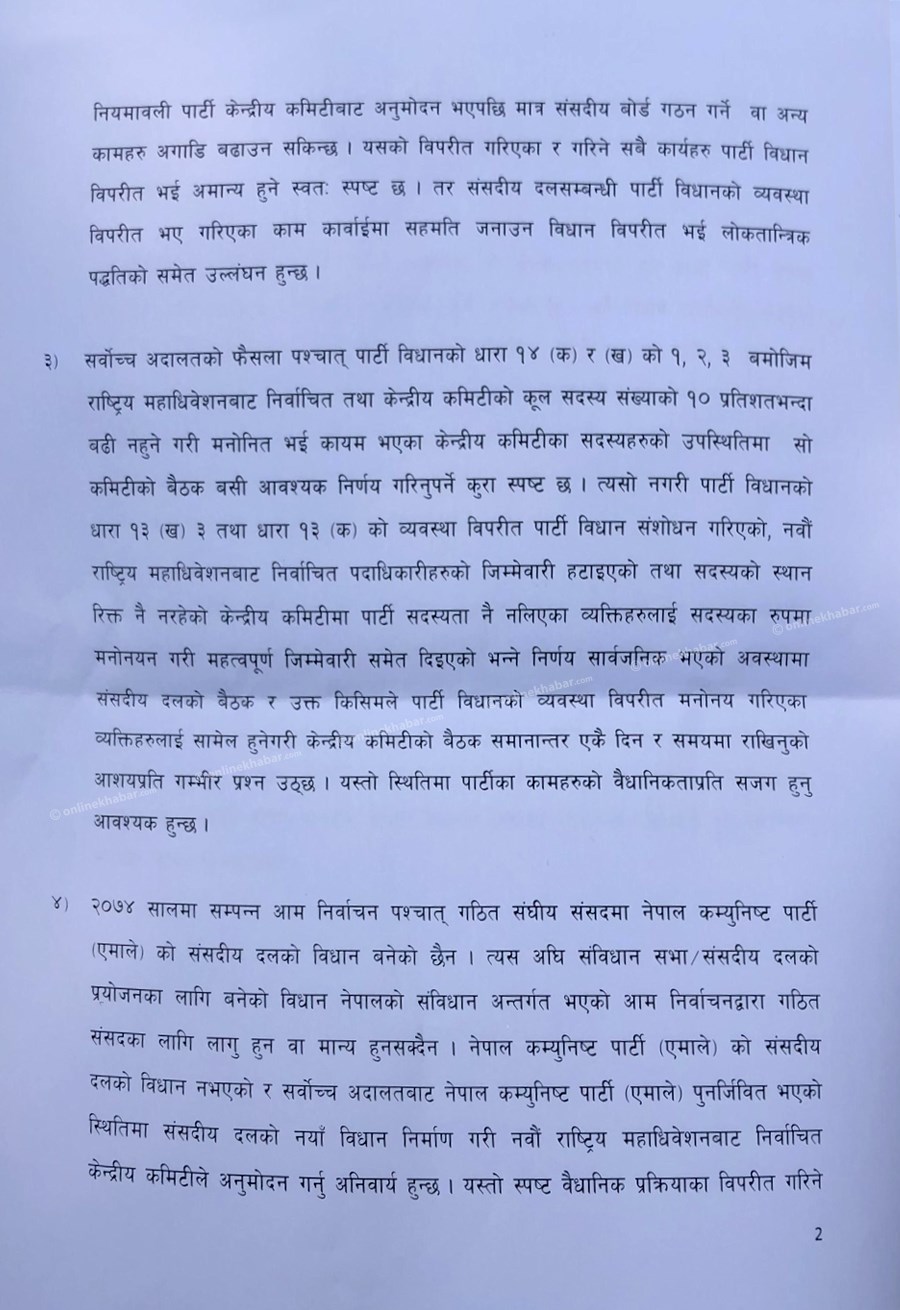 उनीहरूलाई संसदीय दलको बैठक र पार्टी केन्द्रीय कमिटी बैठकमा सहभागी हुन नसक्नुको कारण उल्लेखित पत्र पठाइएको थियो, जहाँ नेपाल-खनाल पक्षका ३८ जनाको सांसदको हस्ताक्षर रहेको छ र जुन पत्रमा पाँच-बुँदे असहमति उल्लेख छ।