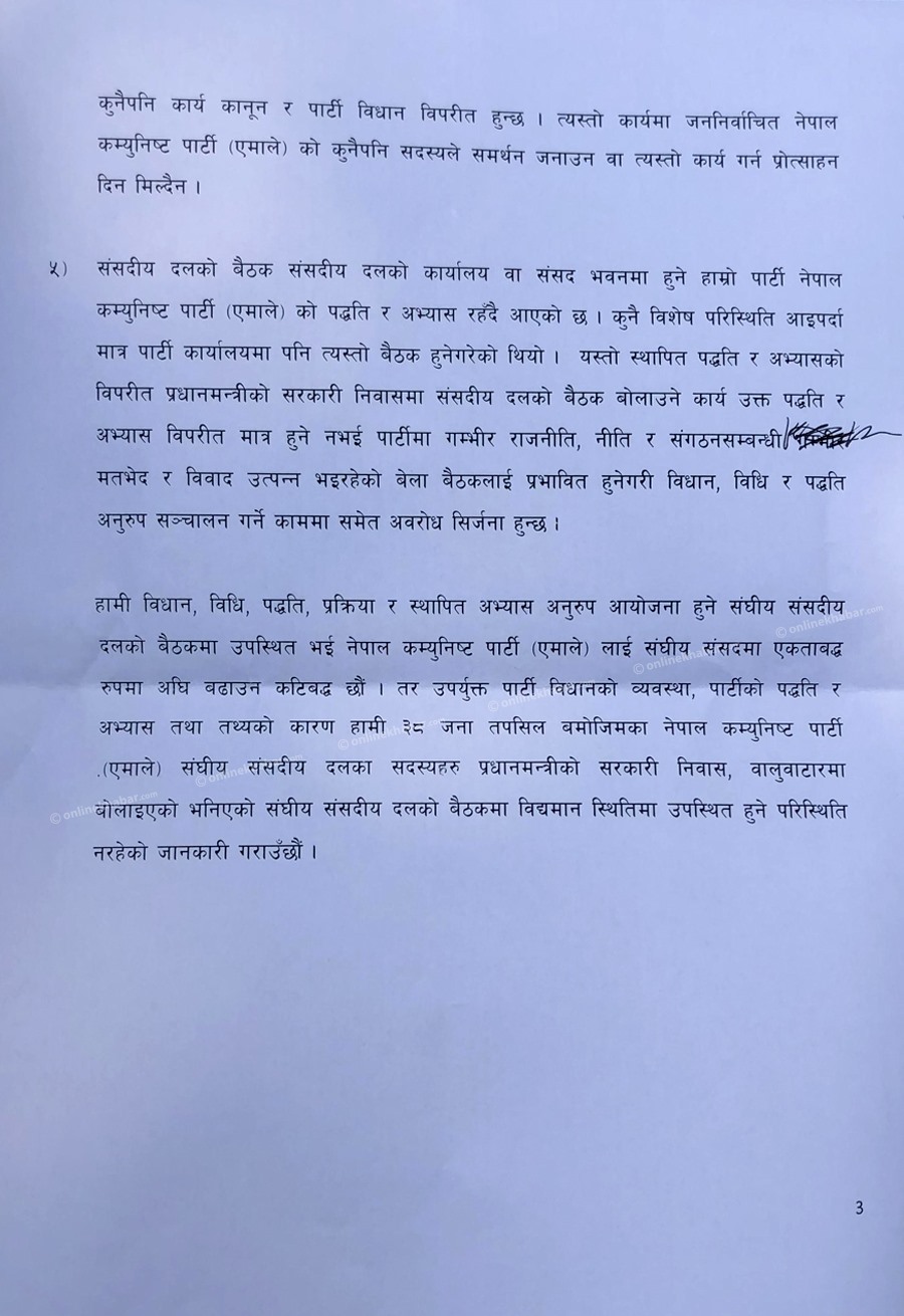असहमति पत्रमा ३८ जना सांसदको हस्ताक्षर रहेको छ।