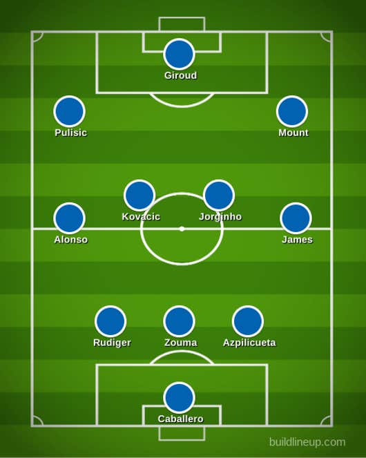चेल्सीको अनुमानित शुरूआती ११ : काबालेरो, एज्पिलिक्युएटा, जुमा, रुडिगर, जेम्स, जर्जिन्हो, कोभासिच, एलोन्सो, पुलिसिक, जिरुड, माउन्ट।