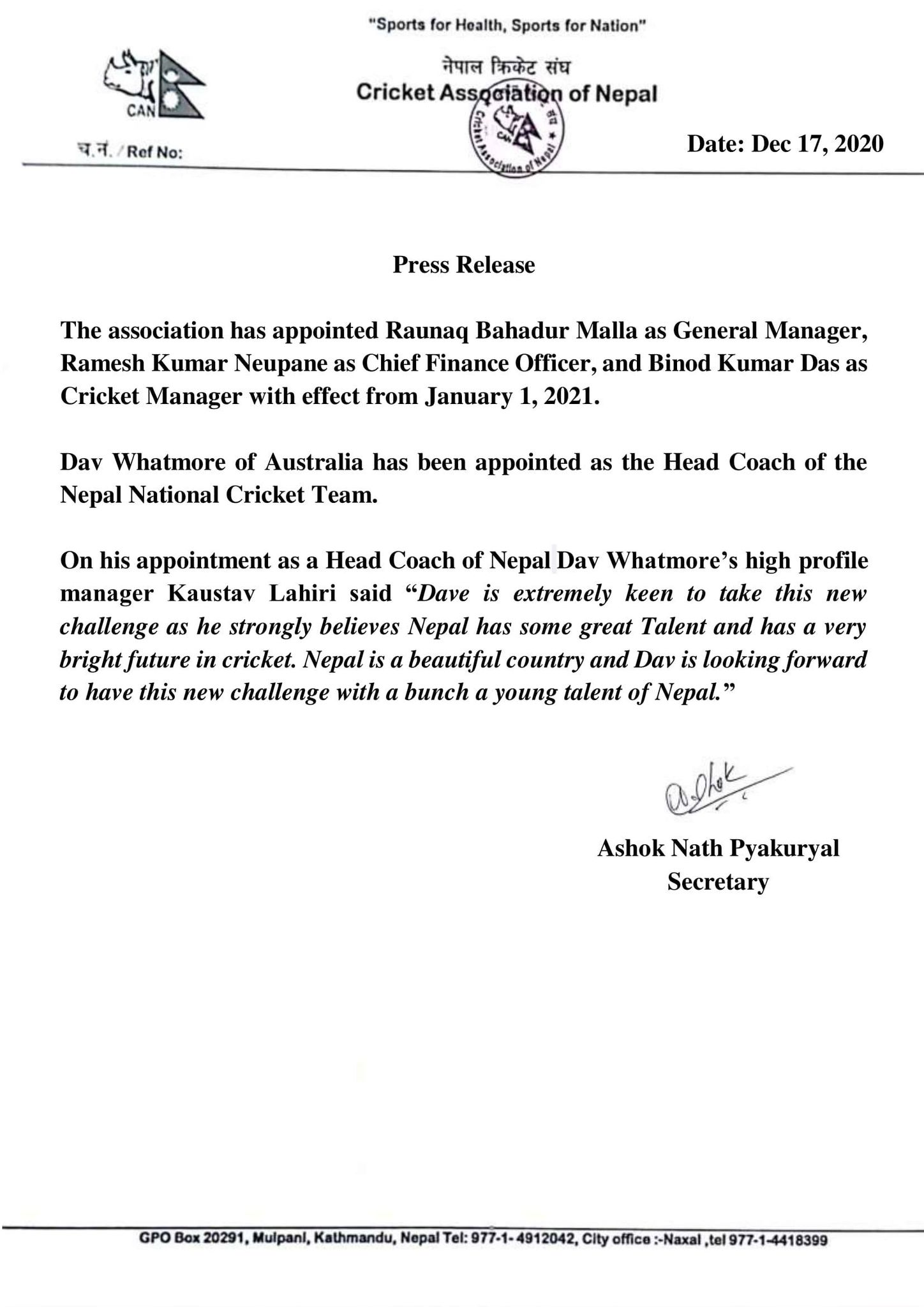 क्यानले रौनकबहादुर मल्ललाई जनरल म्यानेजर, रमेशकुमार न्यौपानेलाई सिफ फाइनान्स अफिसर र विनोद दासलाई क्रिकेट म्यानेजरमा नियुक्त गरेको छ।