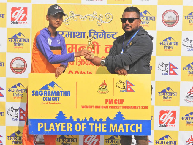 " /> काठमाडौं। अनुराधा चौधरीको अविजित अर्धशतकप्रेरित प्रदेश नम्बर २ ले आज प्रधानमन्त्री कप महिला राष्ट्रिय क्रिकेट प्रतियोगितामा कर्णाली प्रदेशलाई १४३ रनले पराजित गरेको छ।अनुराधाले अविजित ६९ रन बनाएपछि दाङको लमहीस्थित देउखुरी क्रिकेट मैदानमा टस जितेर ब्याटिङ गरेको प्रदेश दुईले निर्धारित २० ओभरमा तीन विकेट गुमाएर १६५ रन बनाएको थियो। १६६ रनको लक्ष्य पछ्याएको कर्णाली प्रदेशले ९ विकेट गुमाएर २२ रन मात्र बनाउन सक्यो।