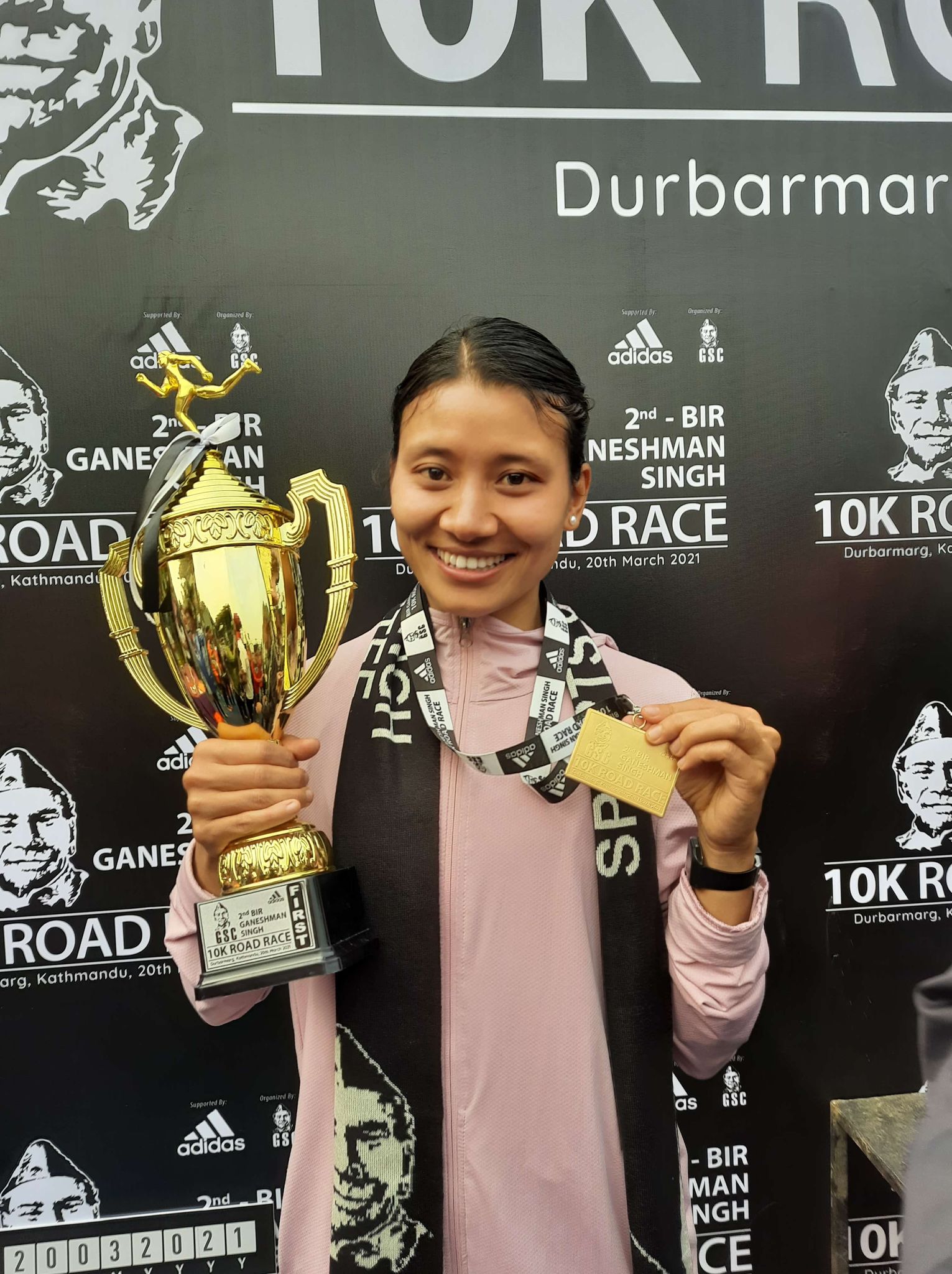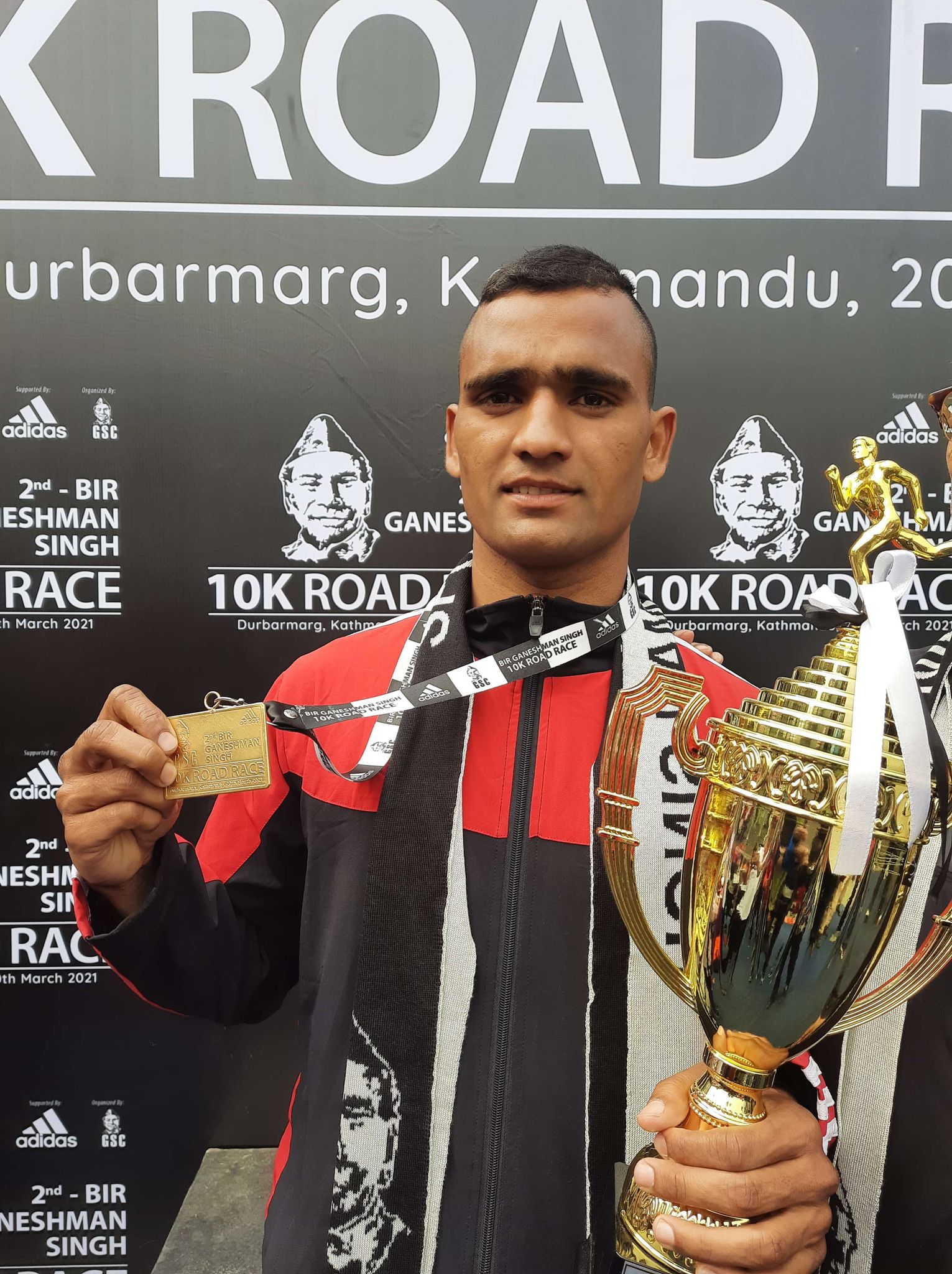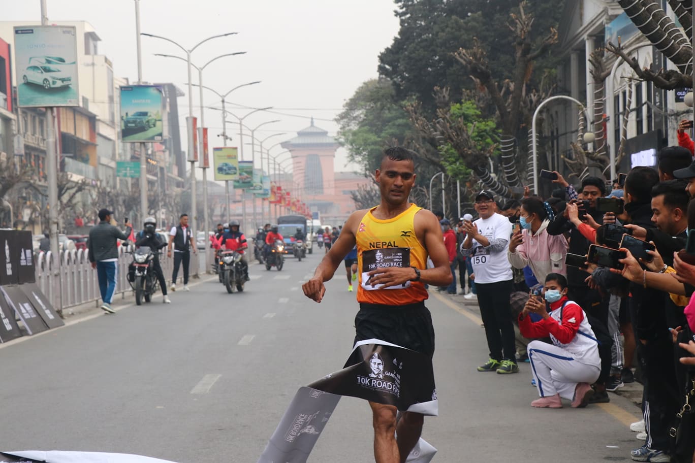 " /> काठमाडौं। तेह्रौं सागका स्वर्ण पदक विजेता गोपीचन्द्र पार्की र सन्तोषी श्रेष्ठले वीर गणेशमान सिंह १० किलोमीटर रोड रेस दोस्रो संस्करणमा स्वर्ण पदक जित्न सफल भएका छन्।सशस्त्र प्रहरी बलका गोपिचन्द्रले ३१ मिनेट ४४.४९ सेकेण्डमा दुरी पार गरी स्वर्ण पदक जितेका हुन्। उनले गतवर्ष ३२.०१.०२ सेकेन्डमा दुरी पूरा गरेका थिए। टोकियो ओलम्पिकमा म्याराथनको तयारी गरिरहेका गोपीचन्द्रले गत वर्षको आफ्नै समयमा सुधार गरे। गत वर्ष नेपालमै सम्पन्न तेह्रौ सागमा गोपीचन्द्रले ५ हजार मिटर दौडमा स्वर्ण पदक जितेका थिए।