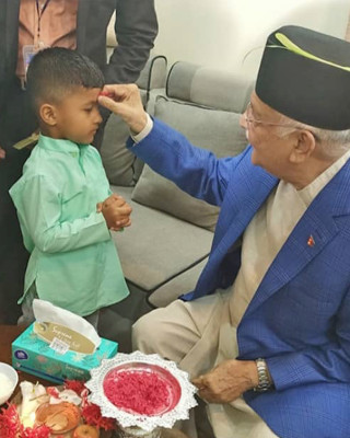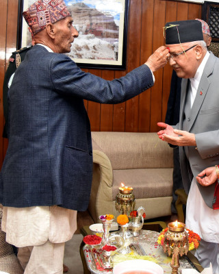 एमाले अध्यक्ष केपी ओलीले बुवा र बढीआमाको हातबाट लगाए टीका