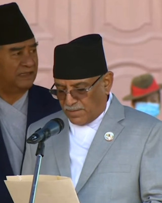 राष्ट्रपति विद्यादेवी भण्डारीबाट प्रधानमन्त्रीको शपथ लिँदै पुष्पकमल दाहाल ‘प्रचण्ड’