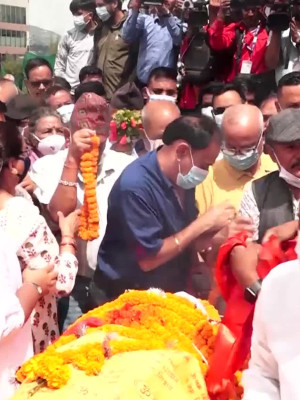 मेडिसिटी अस्पताल प्राङ्गणमा प्रदीप गिरिको पार्थिव शरीरमा श्रद्धाञ्जली अर्पण गर्दै