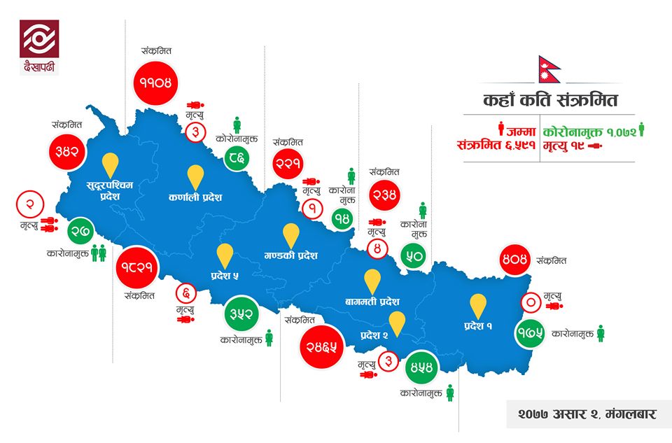 कोरोना संक्रमितको संख्या ६ हजार ५९१ पुग्यो, पछिल्लो २४ घण्टामा थपिए ३८० संक्रमित