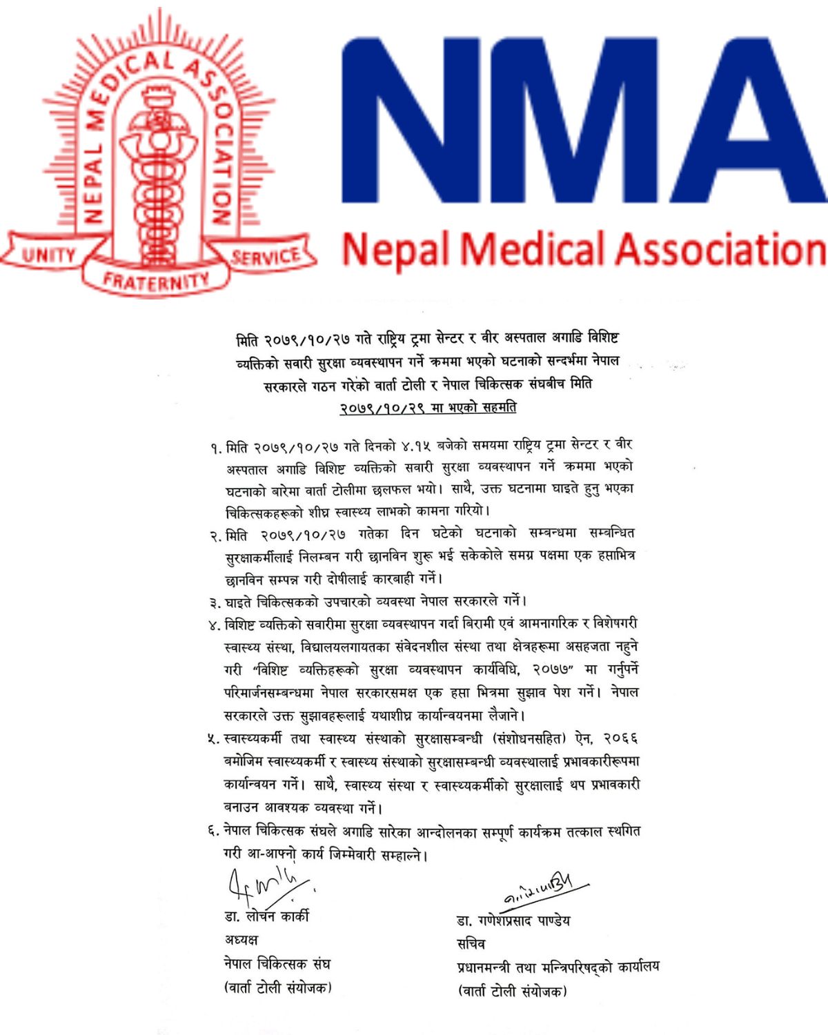 सरकार र नेपाल चिकित्सक संघबीच भएको ६ बुँदे सहमतिमा के छ?