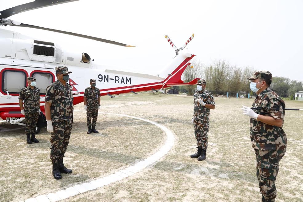 कोरोना महामारीबीच हेलिकोप्टरमा प्रधानसेनापति निस्के निरीक्षण भ्रमणमा