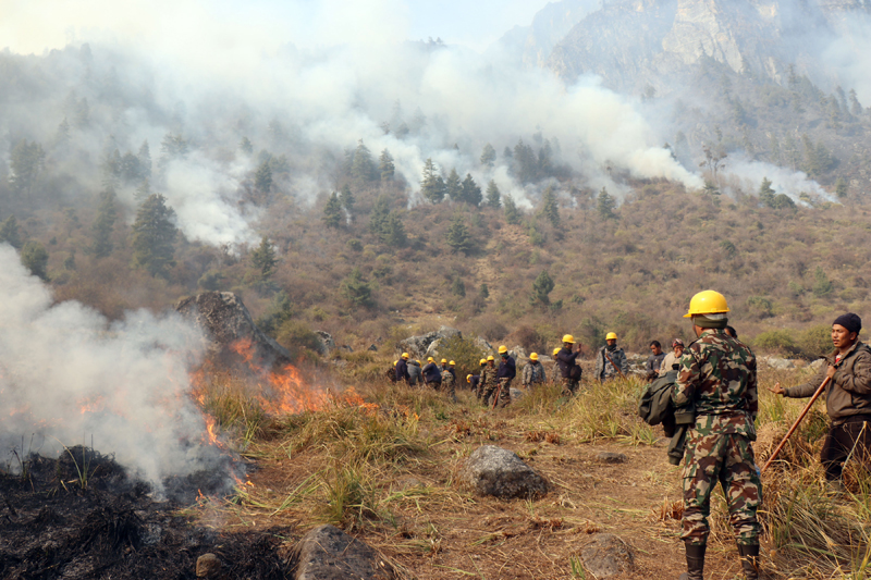 नागार्जुन जंगलमा डढेलो निभाउन हेलिकप्टरबाट पानी खसालिँदै