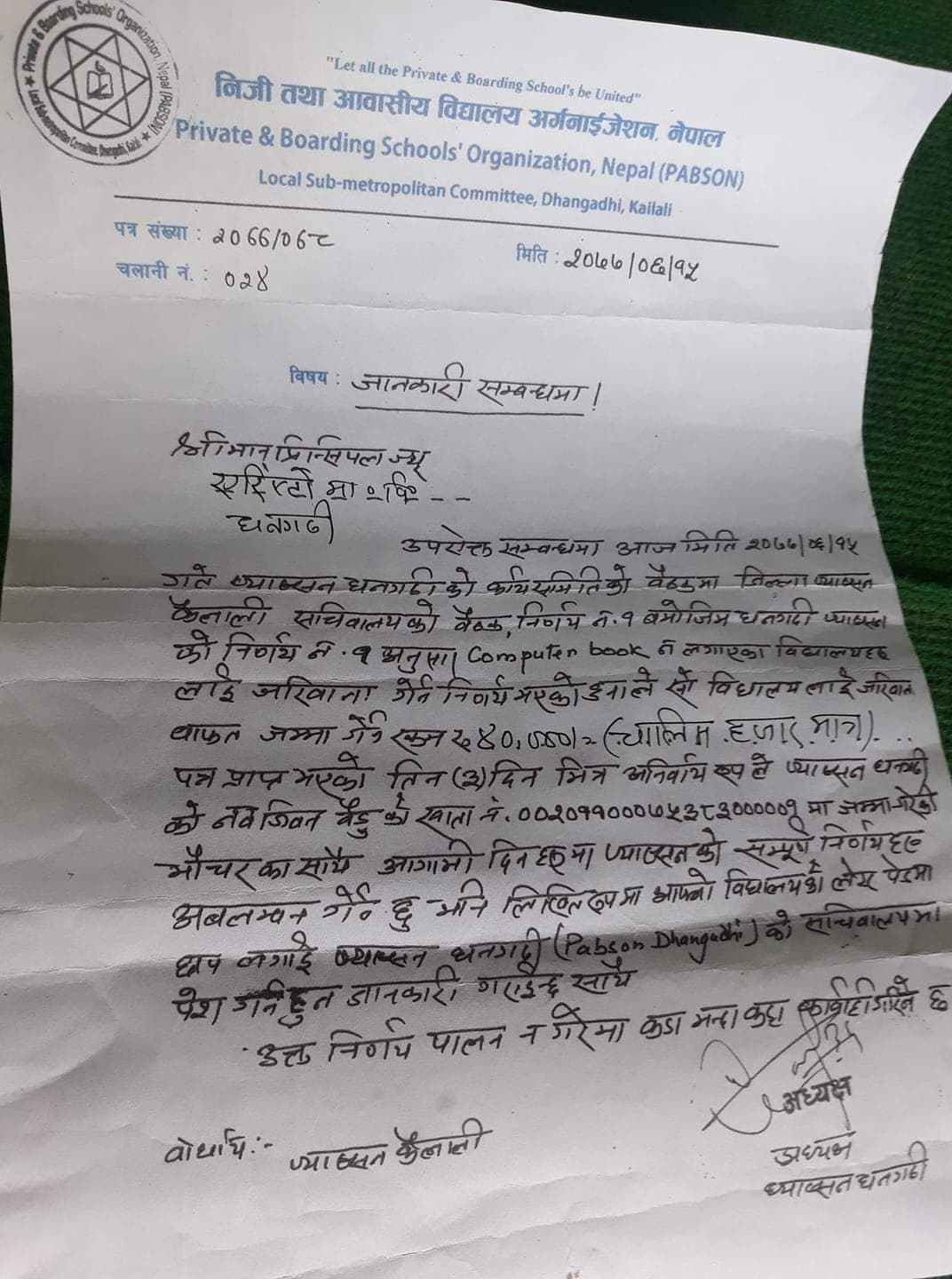 निजी विद्यालयलाई प्याब्सन धनगढीको धम्कीपूर्ण पत्र, ओसन पब्लिकेसनको पुस्तक नलगाए कारबाही