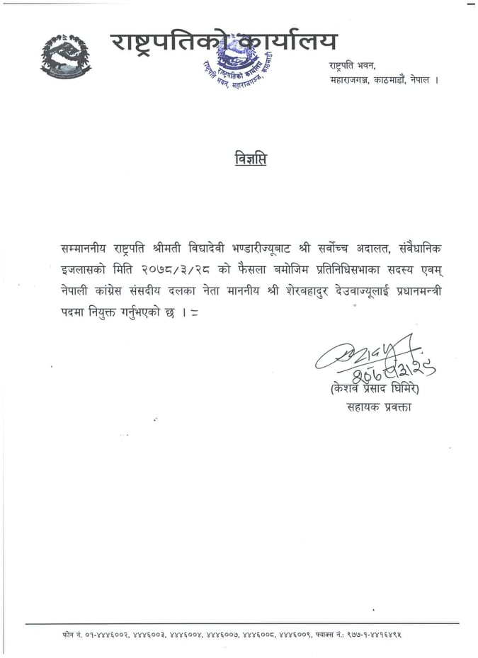 साँझ ६ बजे प्रधानमन्त्री देउवाको शपथ